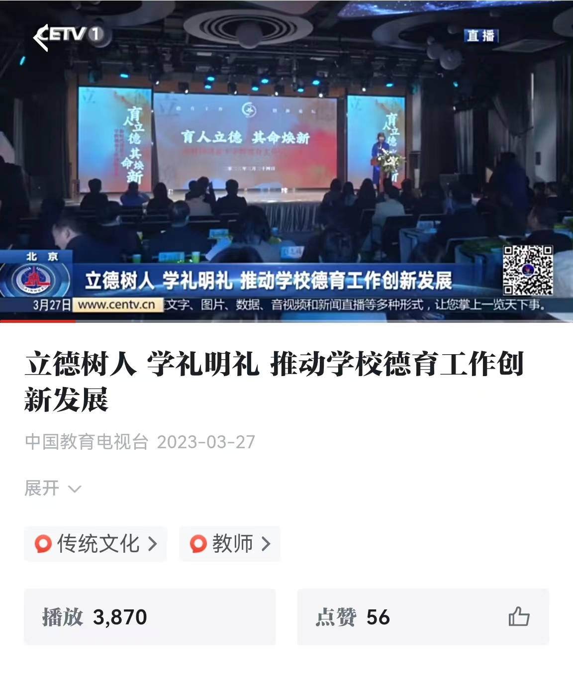 3月28日,“学习强国”平台发布了在我校承办的德育工作现场会的新闻,当日播放量为3870次。